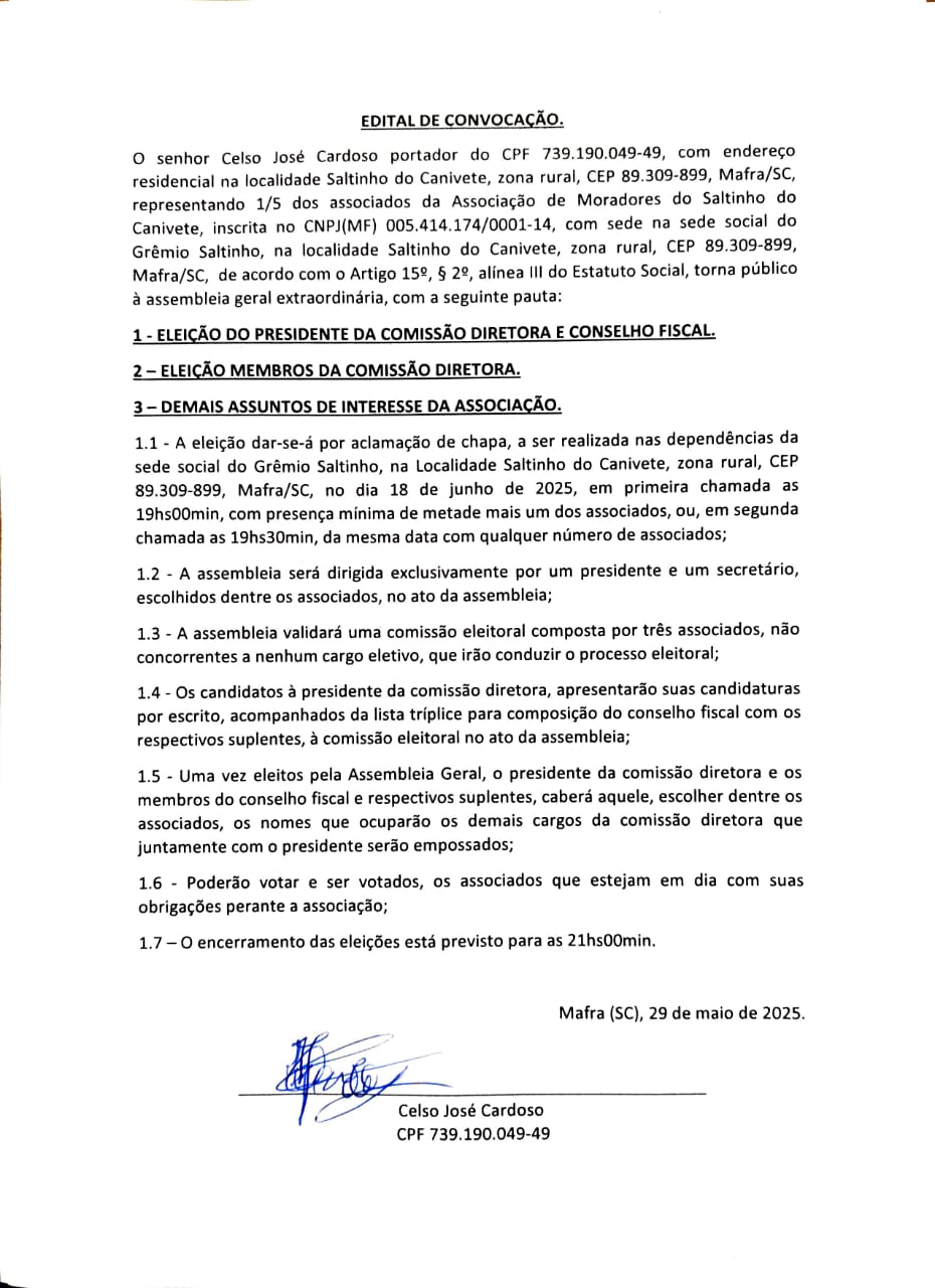 InícioPublicidade LegalAssociação de Moradores do Saltinho do Canivete - Edital de Convocação -... Publicidade Legal Associação de Moradores do Saltinho do Canivete – Edital de Convocação – 29/05/2025 Compartilhado FacebookTwitterWhatsAppCopy URL 29 de maio de 2025 Compartilhado FacebookTwitterWhatsAppCopy URL Artigo anteriorUm novo ponto turístico está sendo construído em Rio NegroPróximo artigoCâmara aprova campanha sobre uso consciente de tecnologias digitais