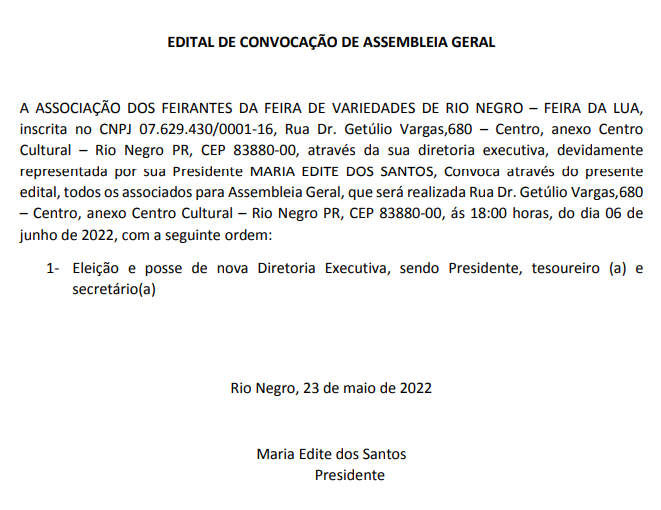 Associação dos Feirantes da Feira de Variedades de Rio Negro – Feira da Lua – Edital de Convocação – 23/05/2022