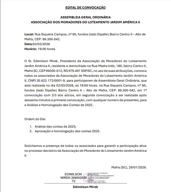 InícioPublicidade LegalAssociação dos Moradores do Loteamento Jardim América II - Edital de Convocação... Publicidade Legal Associação dos Moradores do Loteamento Jardim América II – Edital de Convocação – 29/01/2026 Compartilhado FacebookTwitterWhatsAppCopy URL 29 de janeiro de 2026 Compartilhado FacebookTwitterWhatsAppCopy URL Artigo anteriorDois homens são identificados após tentativa de arrombamento na BR-280, em MafraPróximo artigoMelhorias do solo, pastagens e nutrição do rebanho fortalecem pecuária leiteira do Paraná