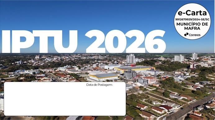 Caso o cidadão ainda não tenha recebido o carnê de pagamento, pode consultar os valores e emitir as guias para pagamento através do site do município www.mafra.sc.gov.br ou diretamente pelo link IPTUMafra2026. Em caso de dúvidas, entrar em contato com a Prefeitura, no Departamento de Controle Tributário, pessoalmente ou pelo telefone (47) 3641-4028 ou ainda pelo e-mail: trib@mafra.sc.gov.br