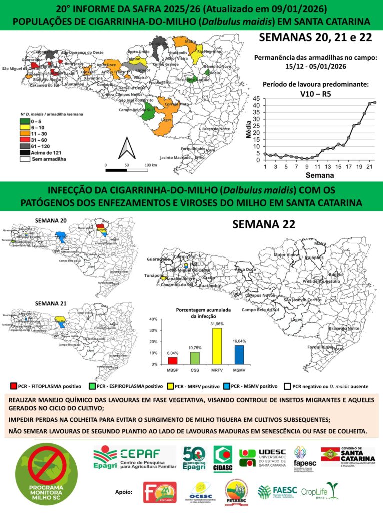 O Programa Monitora Milho SC acompanha semanalmente 55 lavouras localizadas em todas as regiões do Estado. Até o momento, analisou 3.592 insetos com suspeita de infecção e realizou 2.716 testes de PCR para a detecção dos quatro patógenos transmitidos pela cigarrinha-do-milho: vírus do raiado fino, vírus do mosaico estriado e as bactérias dos enfezamentos vermelho e pálido.