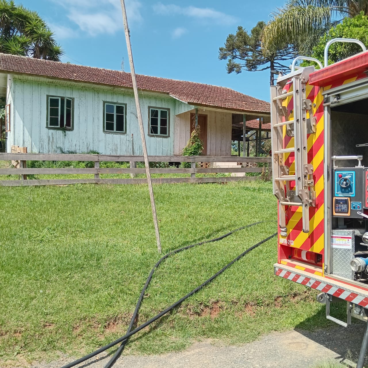 Havia um princípio de incêndio em uma edificação residencial de madeira, com a cobertura telhas de cerâmica, medindo aproximadamente 156m².