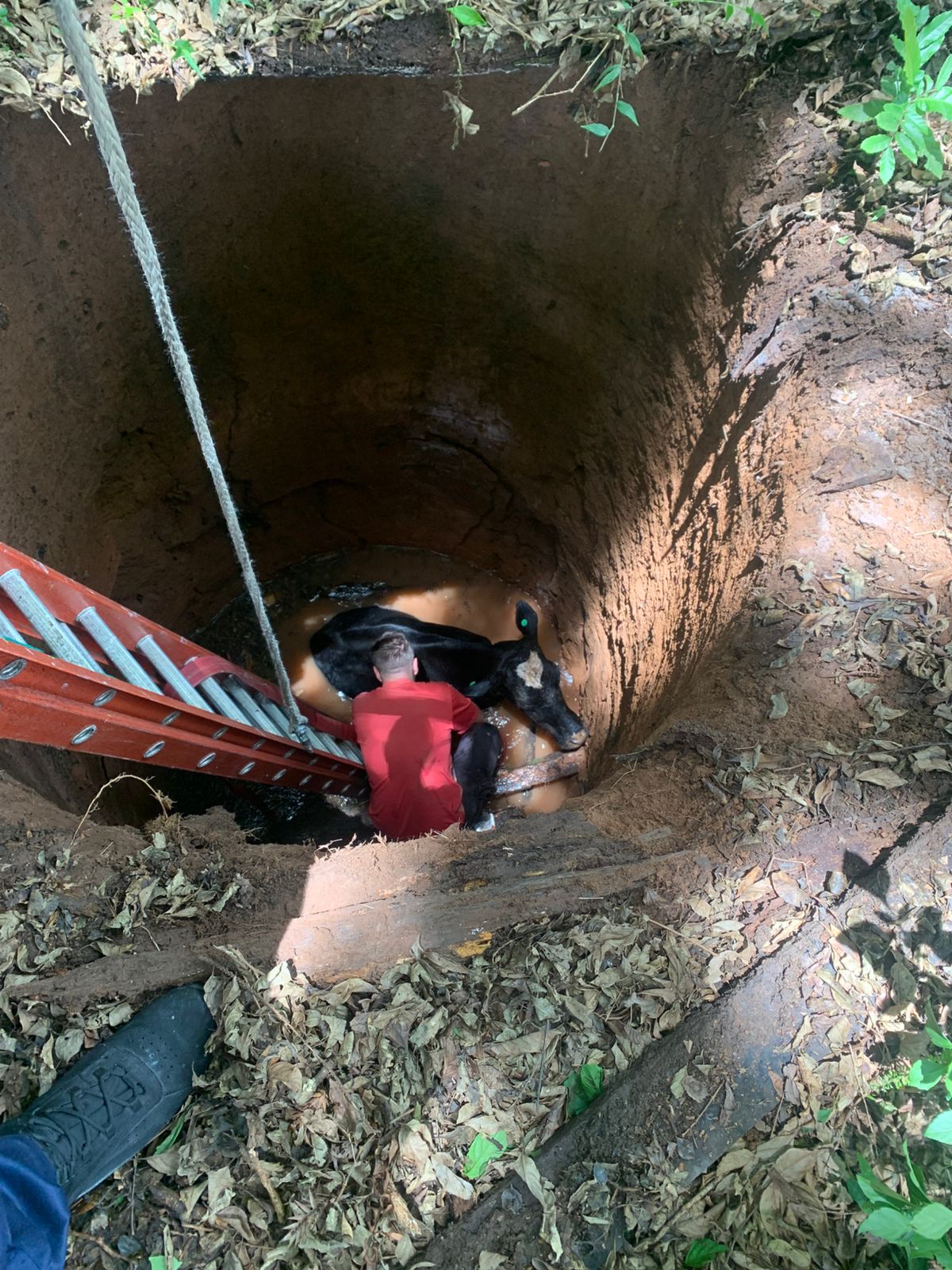 Por volta das 11h15 desta sexta-feira (7), a guarnição foi acionada via COBOM para atender um animal (bovino) em situação de perigo, que havia caído em um poço, nas proximidades de uma residência, na localidade de Campo do Meio, em Irineópolis.