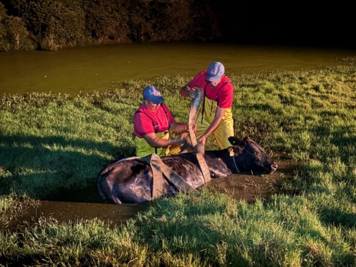 Por volta das 23h50 terça-feira (6), o Trem de Socorro do Corpo de Bombeiros foi acionado para resgatar uma vaca que estava atolada dentro de um açude, na localidade de Rio da Prata, em Papanduva.