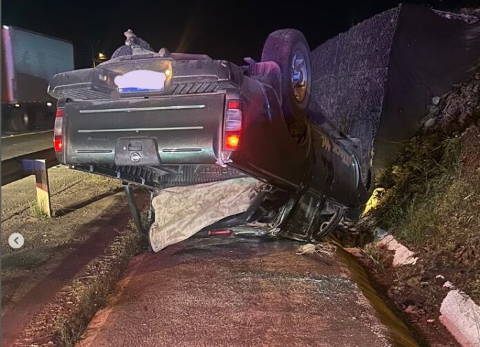 A Nissan/Frontier, com placas Brasil/Mercosul, foi encontrada capotada na lateral da rodovia, sem vítimas presentes no local. A Polícia Rodoviária Federal prestou apoio a ocorrência.