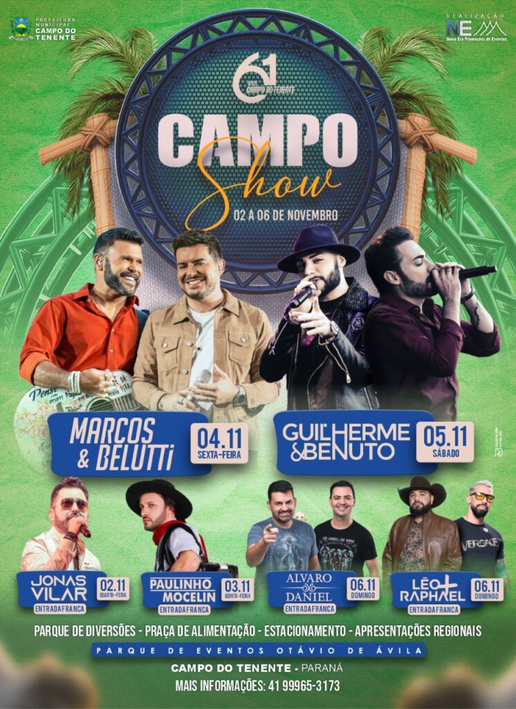 A seguir, confira a programação completa dos shows nacionais que vão ocorrer em Campo do Tenente. Mais informações podem ser obtidas pelo telefone (41) 99965-3173.
