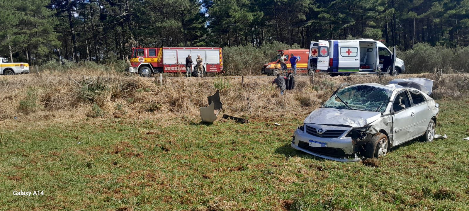 O condutor do Toyota/Corolla, cor prata, perdeu o controle do veículo, saiu da pista e capotou. O homem de 28 anos, já estava sendo atendido pela equipe da UBS de Calmon. Ele estava consciente e orientado, queixando-se de fortes dores na região lombar, com suspeita de fraturas no braço, na perna e arcos costais.