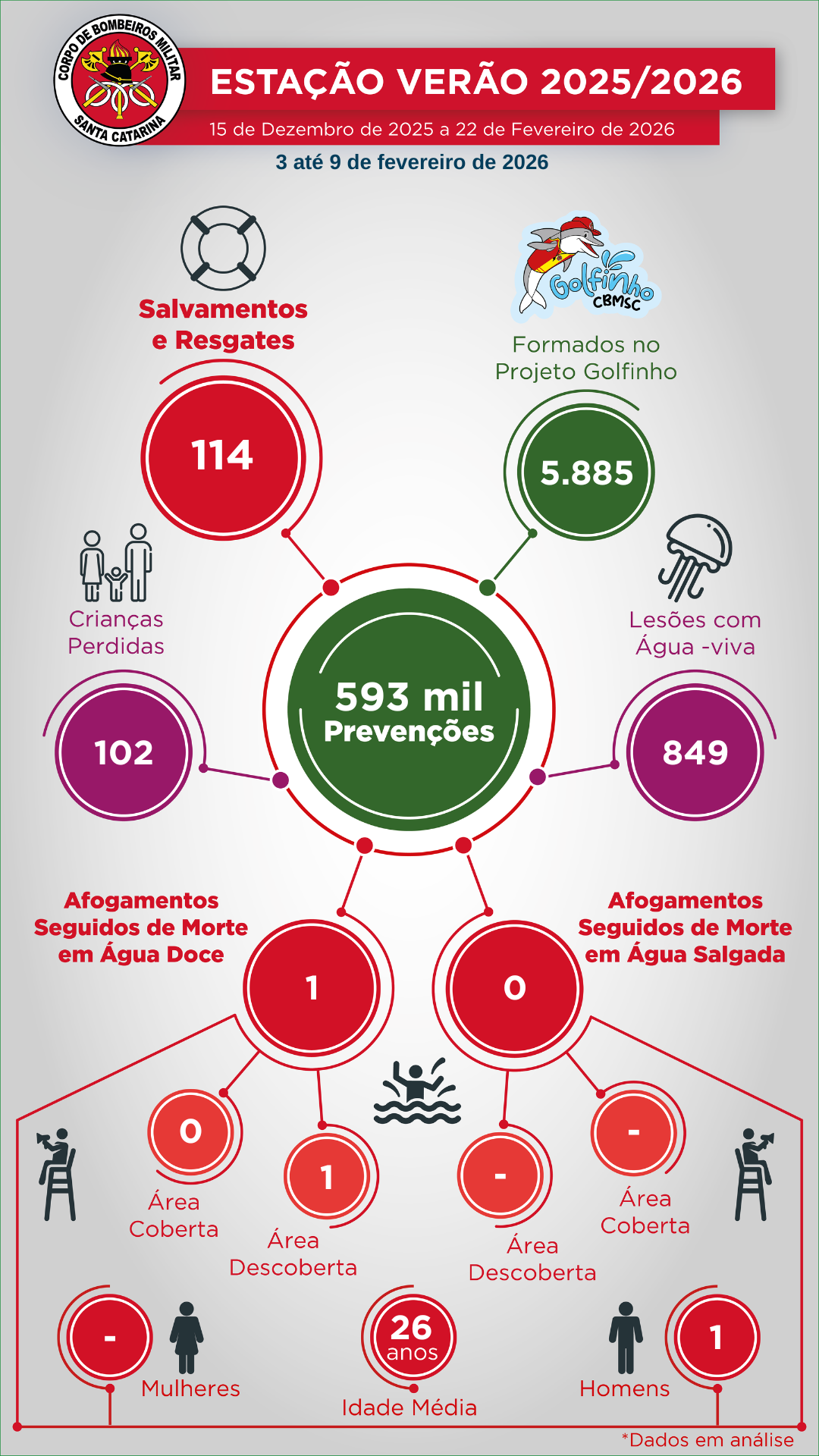 Na última semana, entre os dias 3 e 9 de fevereiro, foram 114 salvamentos e 593 mil ações preventivas das equipes de guarda-vidas civil e militar. Todos os salvamentos envolveram arrastamentos em correntes de retorno, o que liga o alerta para o carnaval. Houve um óbito em água doce de um homem de 38 anos.