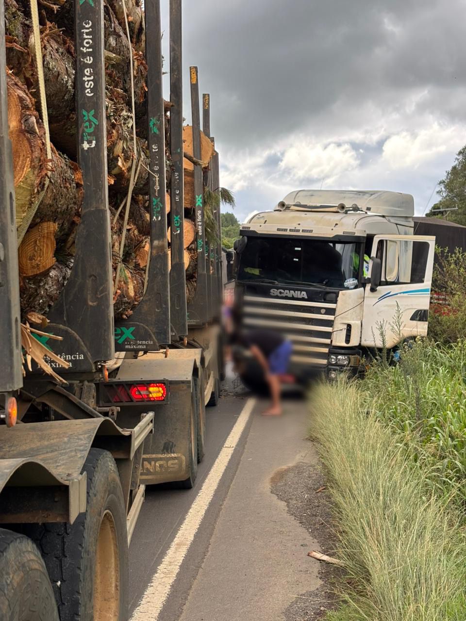 A colisão envolveu duas carretas. O condutor da Scania R124, cor branca, estava caminhando, consciente e orientado. Também estava presente sua esposa. Ambos foram avaliados pela guarnição, não apresentando lesões aparentes nem queixas no momento do atendimento. Informaram estar em boas condições e recusaram atendimento e encaminhamento à unidade hospitalar.