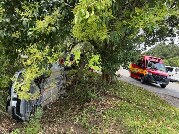 Por volta das 13h15 desta segunda-feira (8), as Guarnições do Corpo de Bombeiros foram acionadas via central de emergências para atender um acidente de trânsito, envolvendo uma colisão traseira entre um Toyota/Etios, cor cinza e um Chevrolet/Onix, cor branca, seguida de capotamento do veículo Etios, na Rodovia SC-418, Bairro Cruzeiro, em São Bento do Sul.