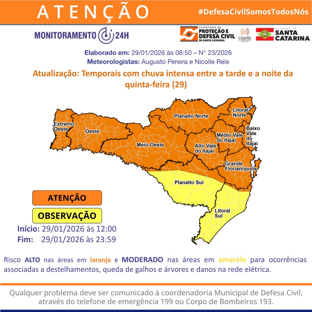 Todas as regiões de Santa Catarina estão em atenção para temporais, conforme aviso da Secretaria de Estado da Proteção e Defesa Civil (SPDC/SC). As instabilidades são esperadas entre a tarde e a noite desta quinta-feira, 29, e podem vir acompanhadas de chuva intensa, raios, rajadas de vento e eventual queda de granizo.