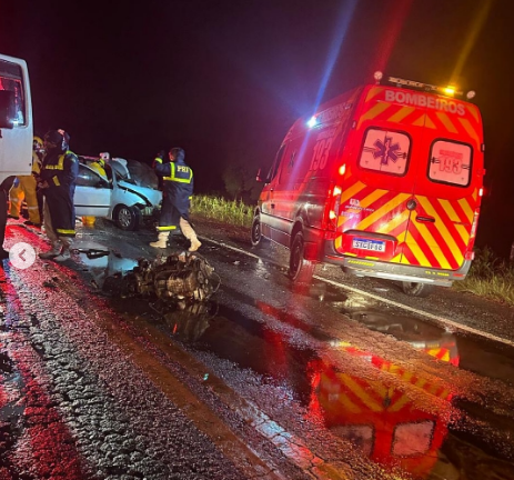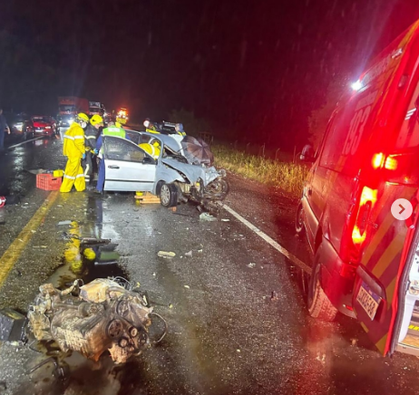 Houve uma colisão frontal entre um carro e um caminhão. No Ford/Cargo, estavam o condutor, um homem de 40 anos, e dois menores de 8 e 11 anos como passageiros.