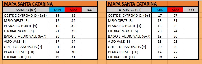 No sábado, 7, as temperaturas seguem elevadas em grande parte de Santa Catarina, com máximas entre 30°C e 38°C, especialmente no Oeste e Extremo Oeste. No Litoral, Vale do Itajaí e Grande Florianópolis, os termômetros ficam em torno dos 31°C a 33°C, enquanto nas áreas mais altas do Planalto Sul e Litoral Sul as máximas ficam próximas dos 30°C. À noite, com a mudança na direção dos ventos, as temperaturas podem cair abaixo dos 20°C nas regiões de maior altitude.