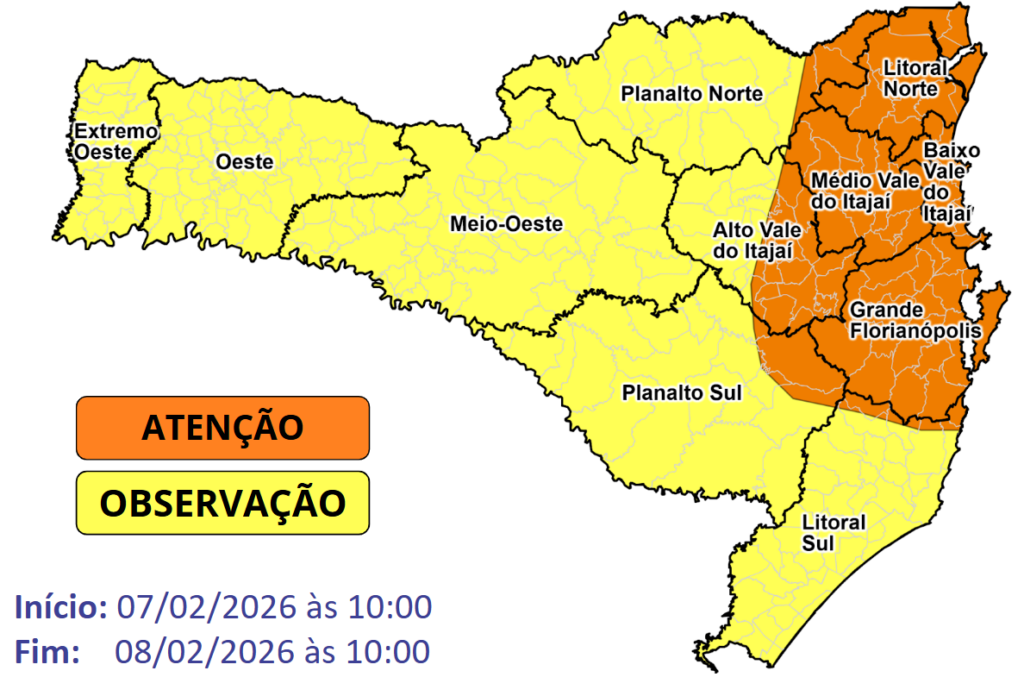 No sábado, 7, o dia ainda começa abafado, com temperaturas próximas ou acima dos 30°C, especialmente no Oeste e no Litoral Norte. A partir do fim da manhã e início da tarde, o avanço do sistema frontal – frente fria – provoca aumento da nebulosidade e ocorrência de chuva. Nesse período, o risco é alto para temporais com chuva intensa entre a Grande Florianópolis, o Vale do Itajaí e o Litoral Norte, e moderado nas demais regiões do estado.