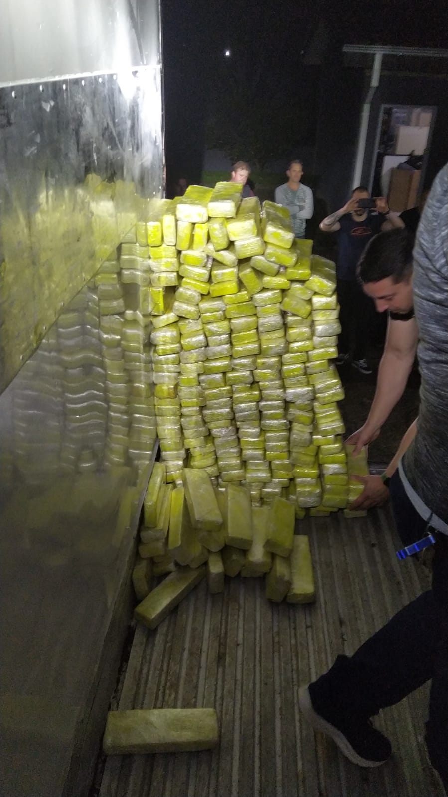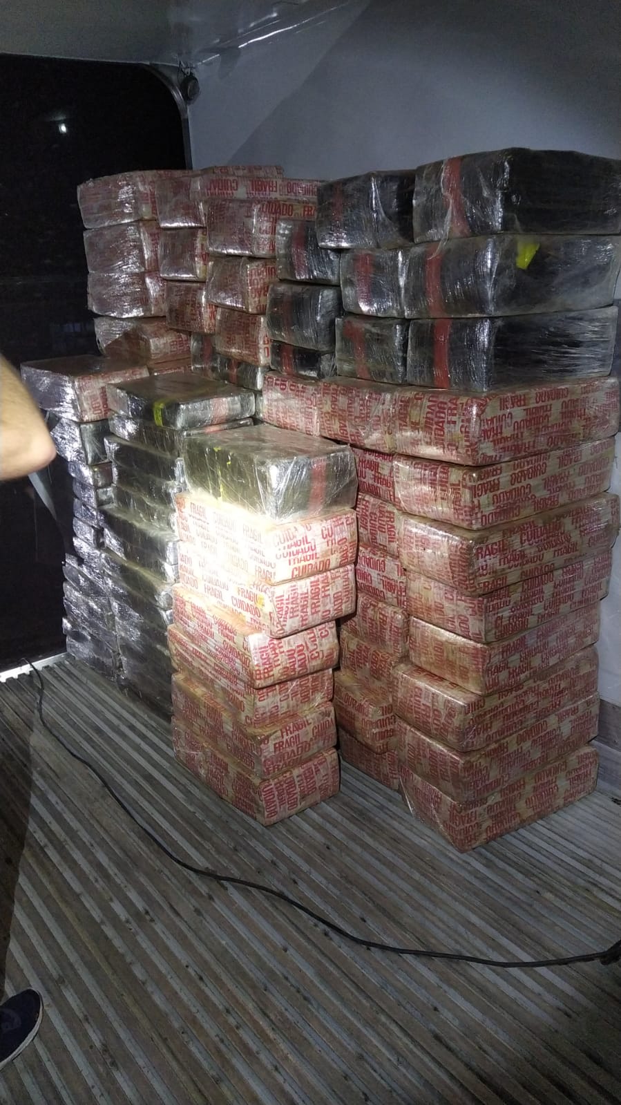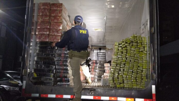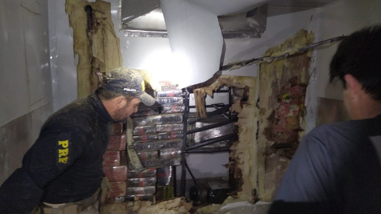 Foi acionada a Polícia Civil, que prestou apoio com cães farejadores. A fiscalização foi aprofundada, até que foi encontrada, em fundo falso, 1.800 kg de tabletes de maconha.