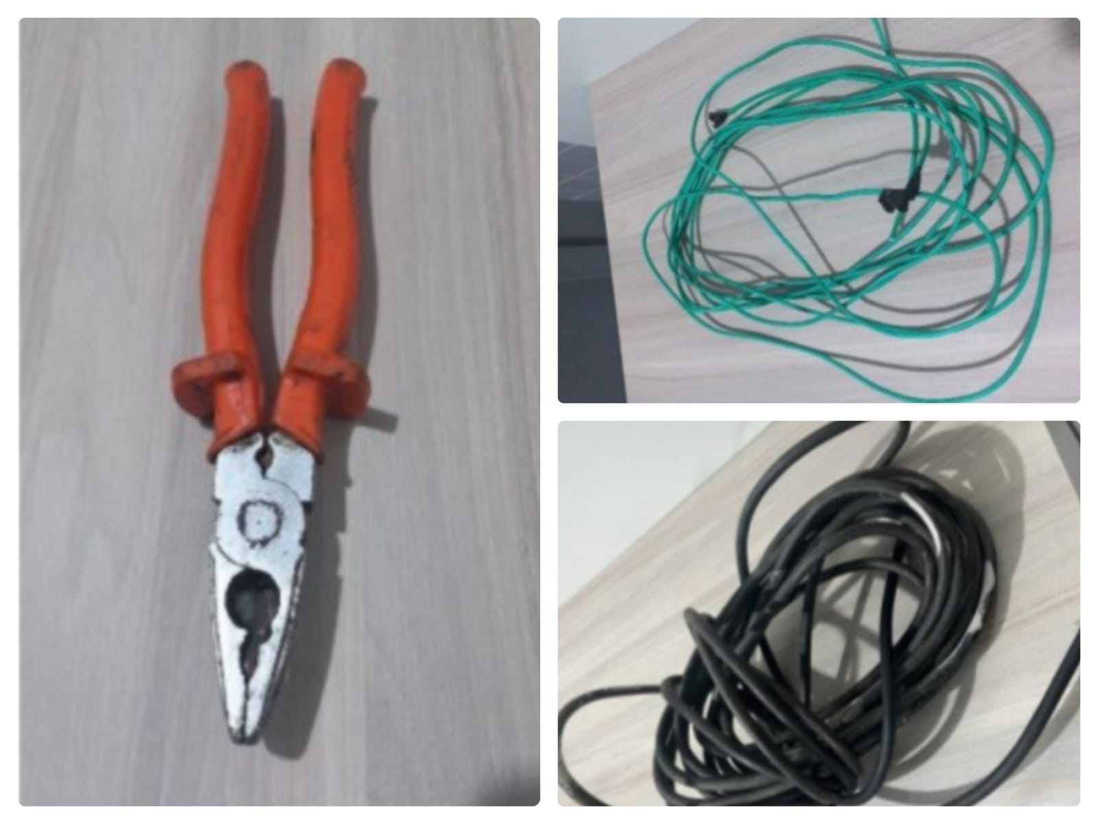 Em uma sacola preta que carregava, foram encontrados 11 metros de fiação preta, 6 metros de fiação verde, 2 metros de fiação azul e um alicate. A vítima reconheceu o suspeito como autor do furto.