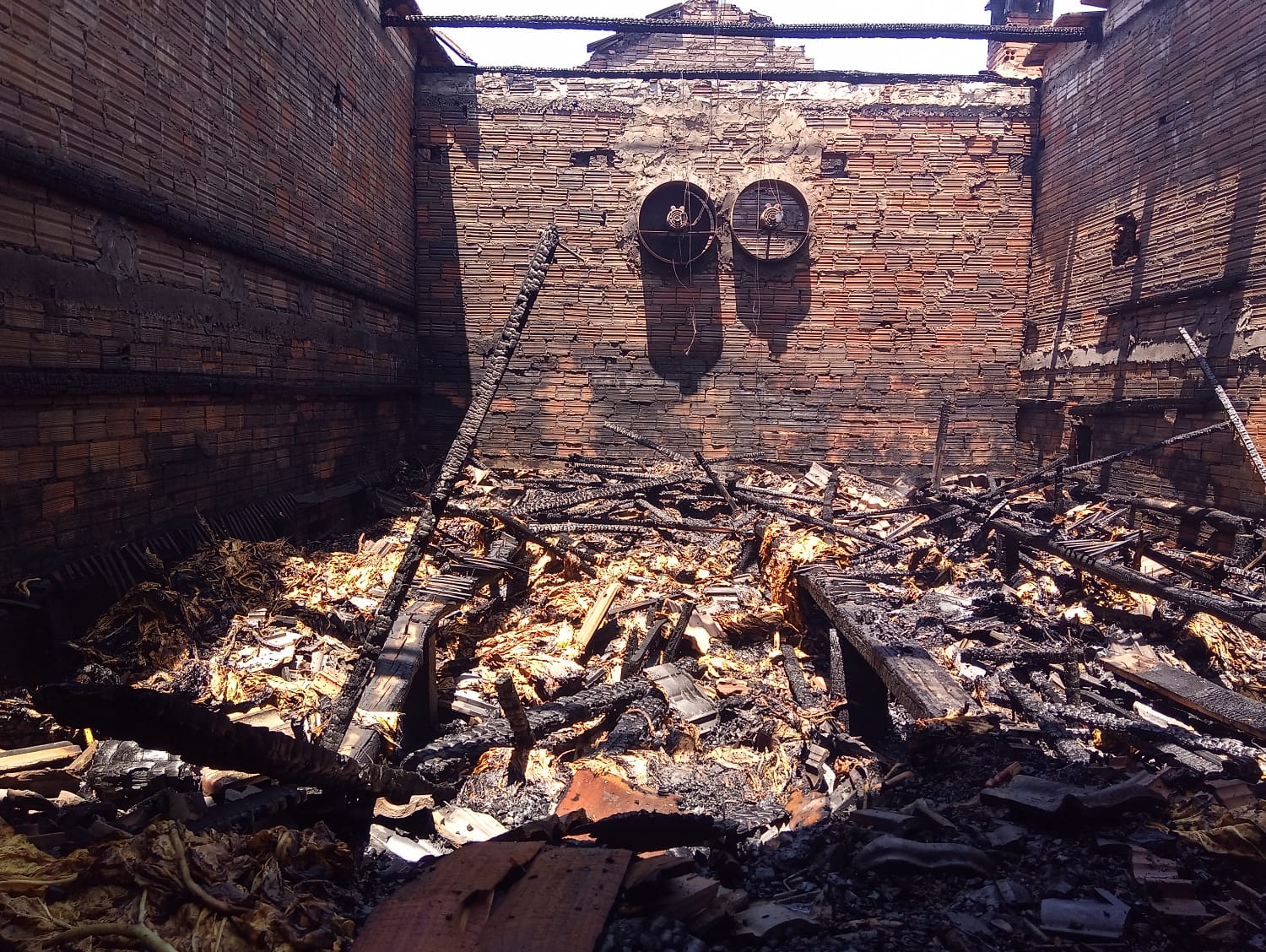 A edificação construída em alvenaria e coberta com telhas de barro apresentava colapso total do teto, mantendo-se as paredes em pé, com perda total do tabaco que se encontrava em fase final de cura. Inicialmente populares tentaram conter as chamas com auxílio de bomba elétrica e realizando captação de água de lagoa existente na propriedade.