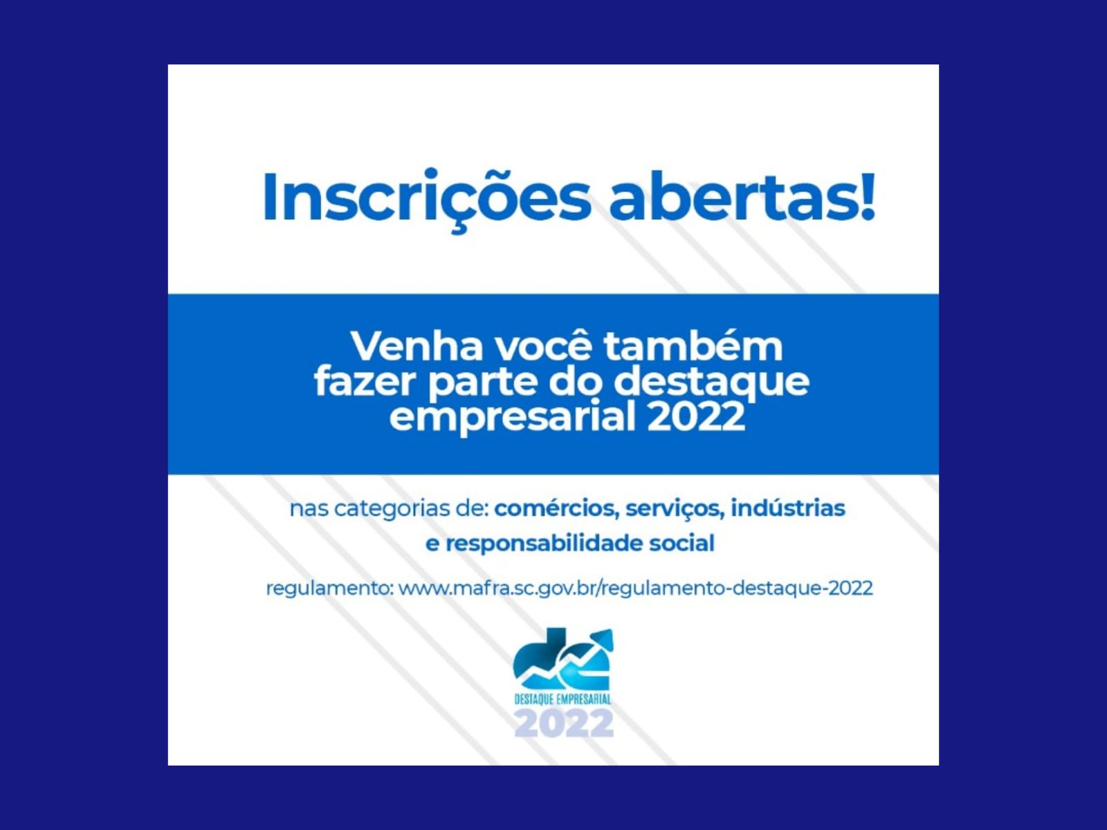 O Prêmio Destaque Empresarial 2022 de Mafra abriu as inscrições a partir do dia 1º de outubro, para premiar empresários locais e também oportunizar às empresas a realização de diagnósticos de gestão, identificando oportunidades e melhorias nos negócios.