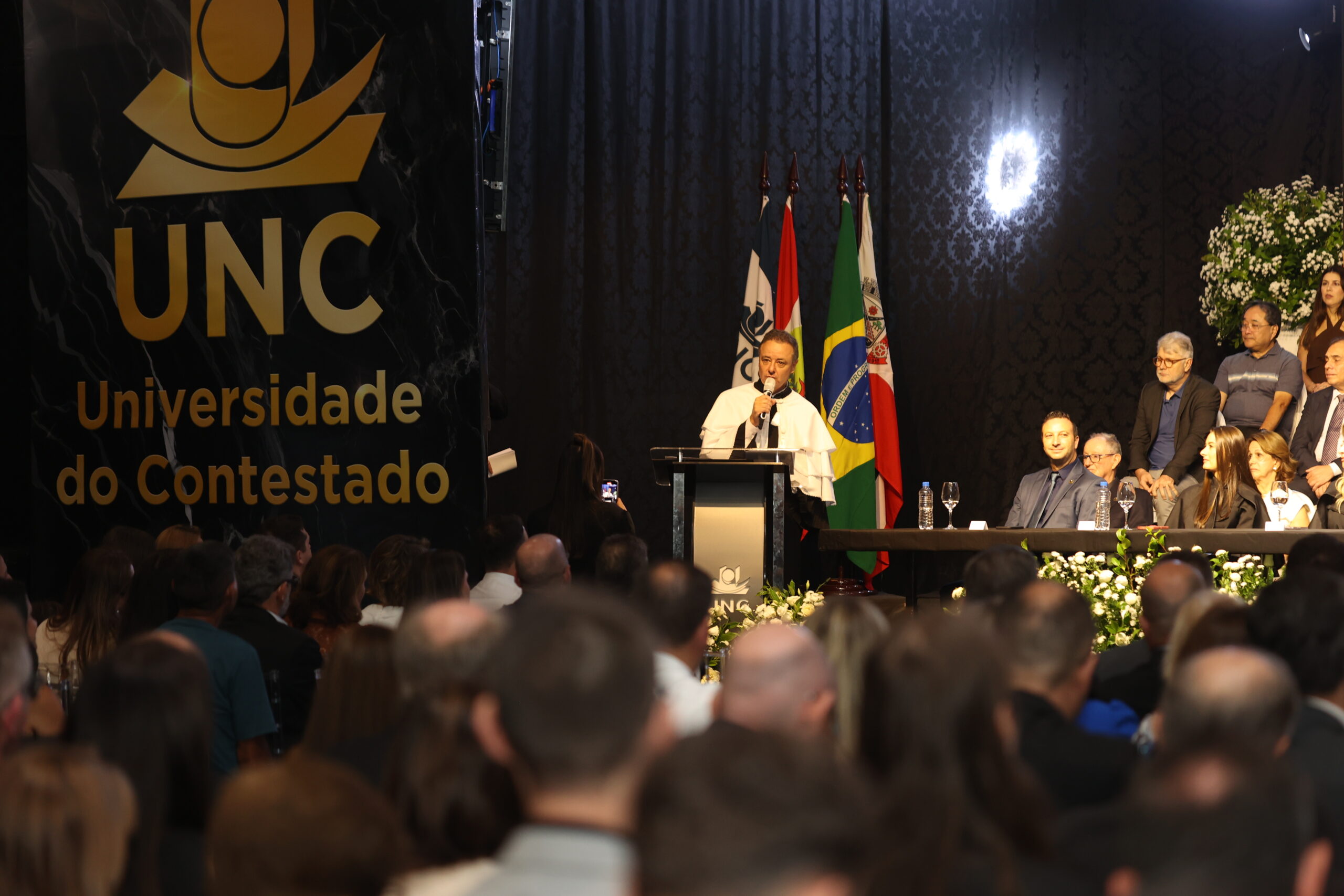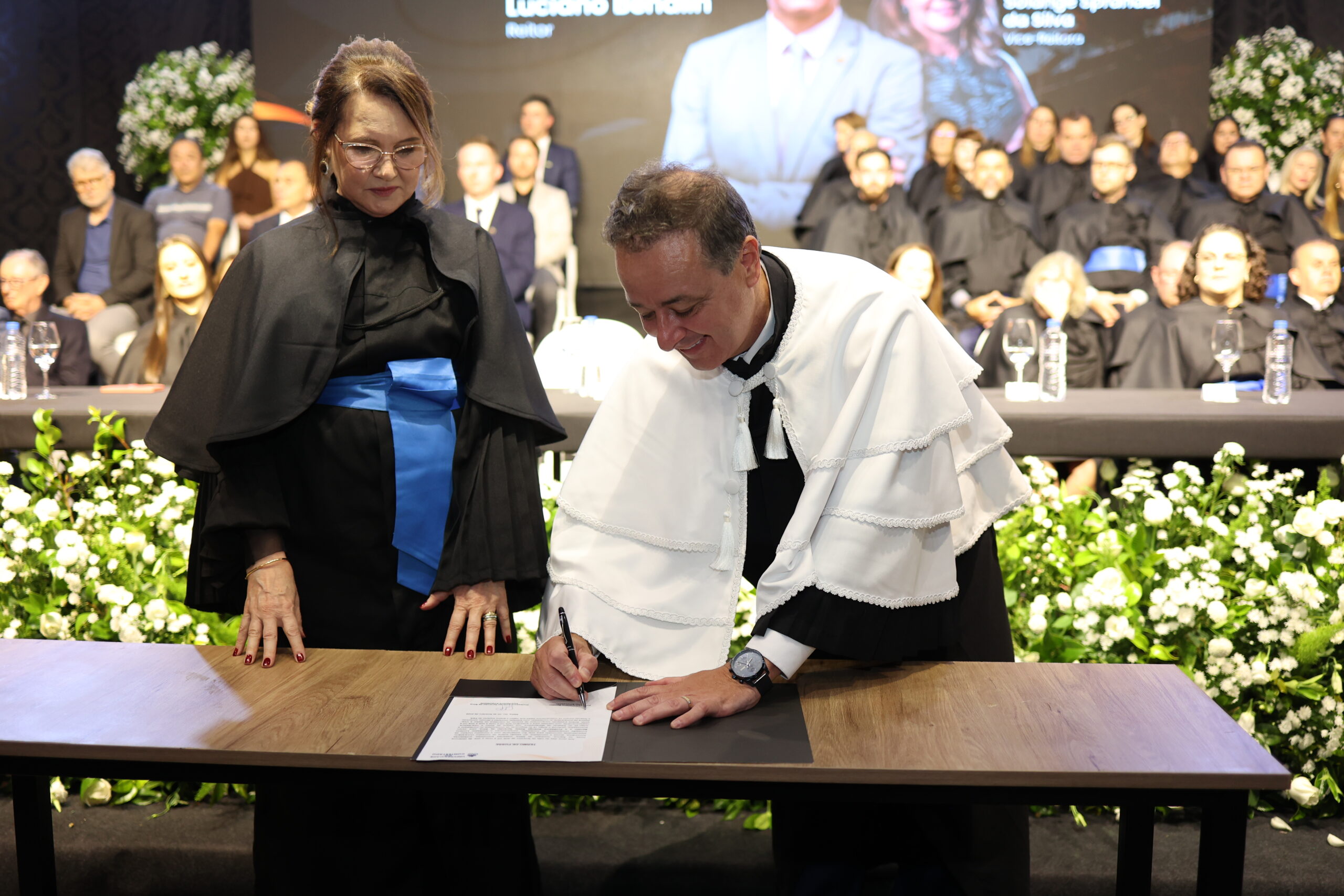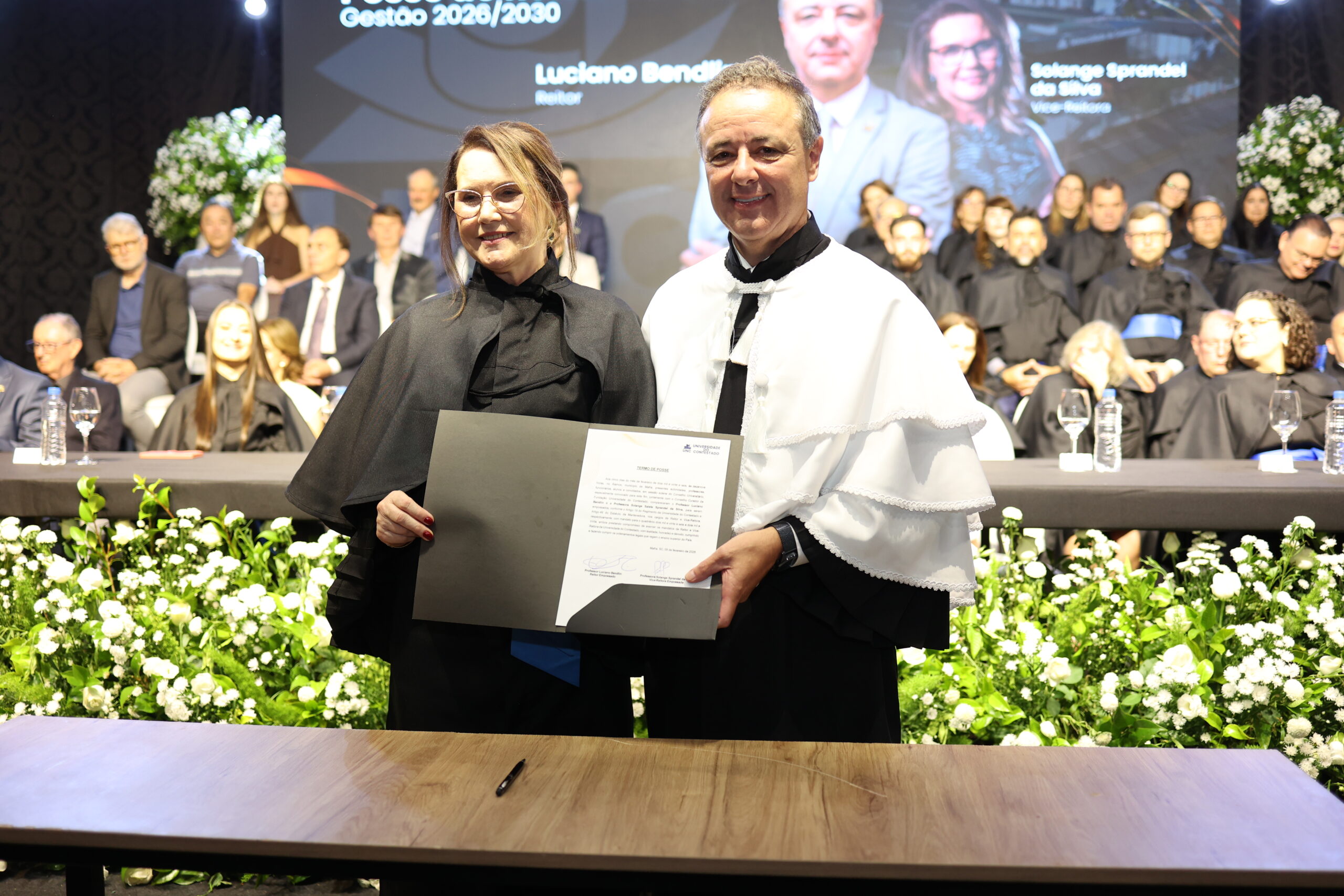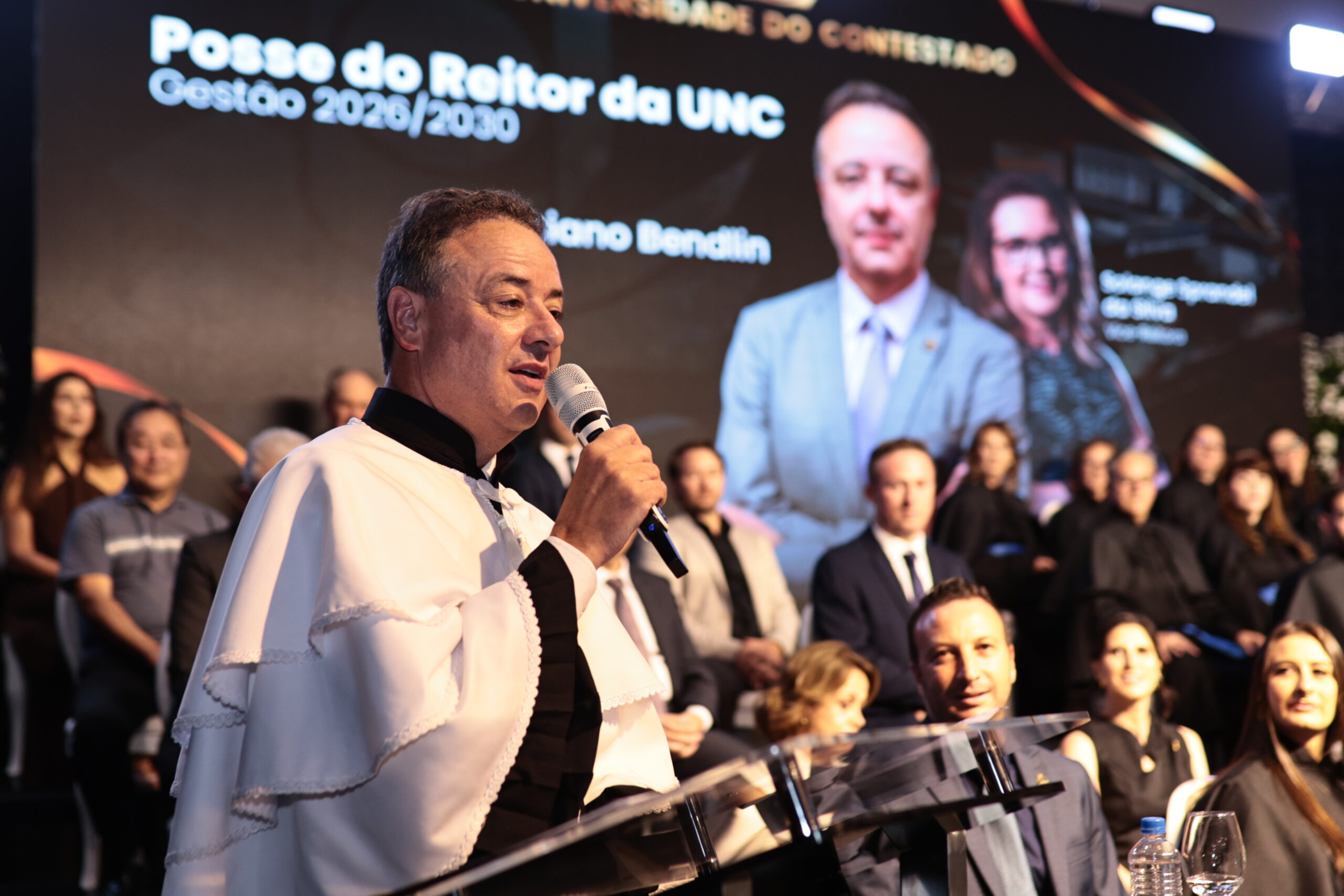 Com o pronunciamento do juramento, o Reitor recebeu também a Samarra, que simboliza a continuidade da história, o peso da responsabilidade e a honra de conduzir a universidade. Recebeu também o Capelo, um símbolo do somatório do conhecimento humano, representa a autoridade intelectual construída ao longo do tempo. Com estes atos simbólicos, Luciano Bendlin dará continuidade aos avanços e transformações promovidas na Universidade do Contestado. “Somos uma instituição relativamente jovem, a pioneira na universidade multicampi – estamos em seis municípios com seis campi com diferentes culturas, valores. O que nos torna únicos e com um potencial enorme. Queremos uma UNC que compreenda as mudanças educacionais e as tendências de transformação digital, assegurando a jornada da aprendizagem”, destacou o Reitor.