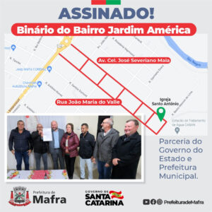 Com o investimento de R$ 5.694.806,10, foi anunciado na noite de ontem, 1º de junho, a execução de obra para implantação de binário no bairro Jardim América e execução de pavimentação. O binário faz parte do Plano Mil, do Governador Carlos Moisés, que esteve em Mafra no mês passado, assinando notas de liberação deste e de outros recursos.