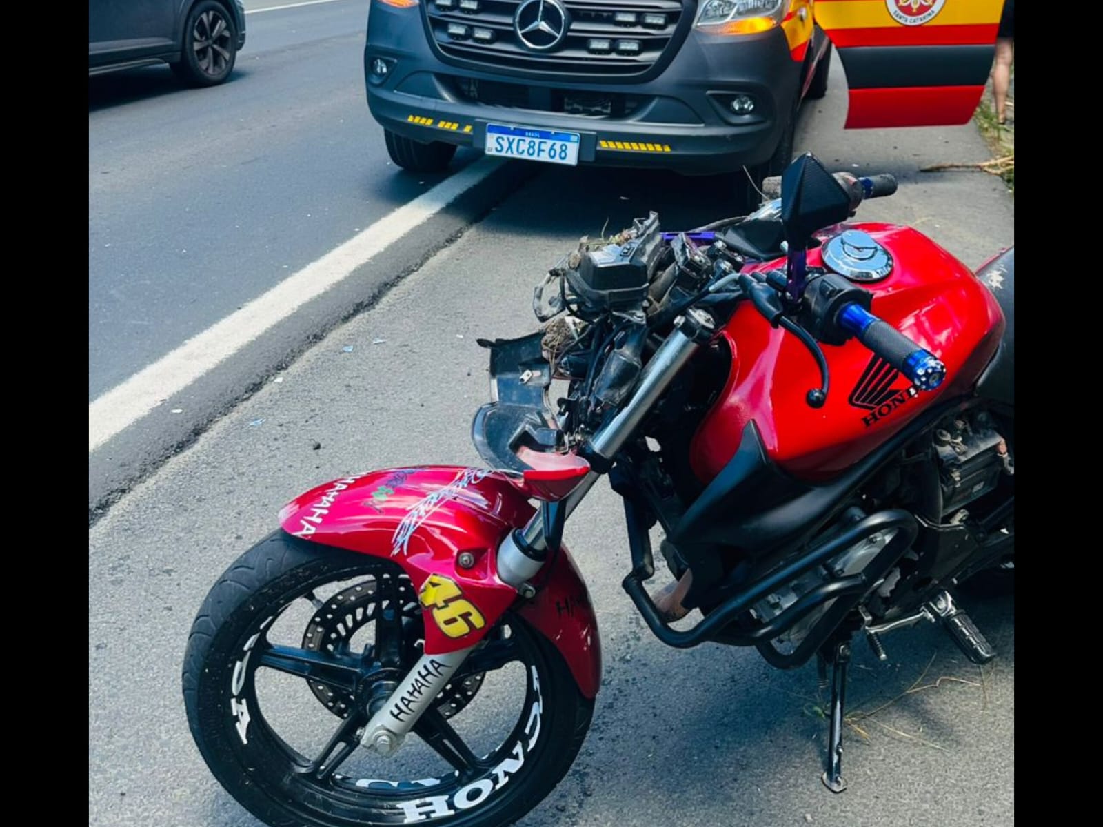 O condutor da motocicleta, um jovem de 21 anos, encontrava-se sentado ao lado da via de rolamento, consciente, orientado, com sinais vitais estáveis, apresentando ferimento abrasivo nas mãos e braços e no membro inferior direito. Após atendimento, foi encaminhado para o Hospital São Vicente de Paulo.