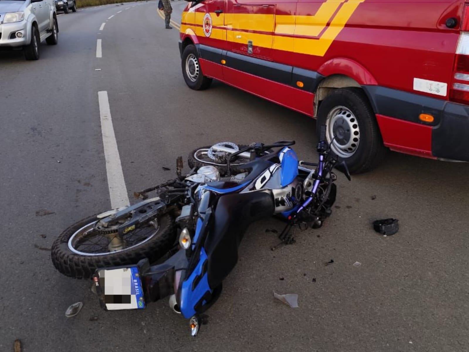 No local, foi encontrada a vítima, um jovem de 21 anos, em decúbito dorsal sobre a via, inconsciente, sem capacete, com presença de familiares e populares.