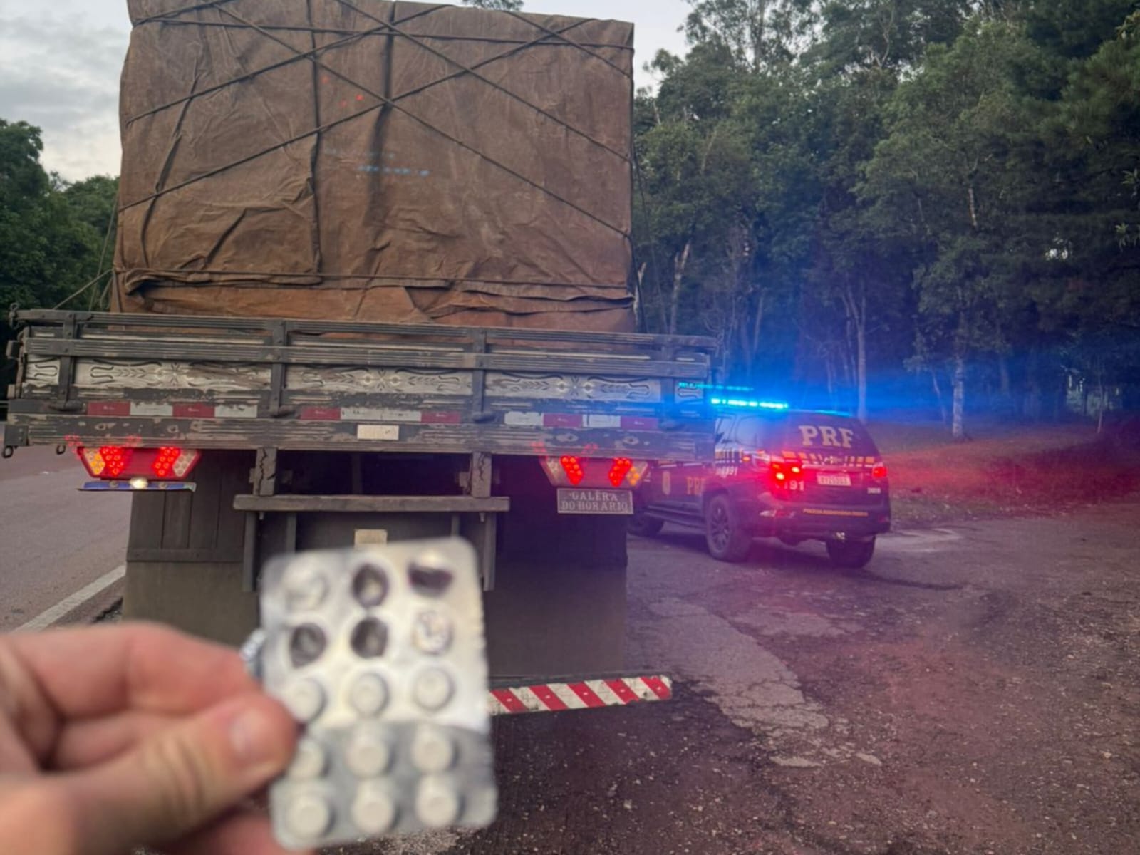 Percebeu-se um comportamento atípico do condutor que foi instruído a descer da cabine para a verificação mais minuciosa. Após busca pessoal, foi localizada, escondida dentro da cueca, uma cartela de comprimidos com 9 unidades intactas e sem seis unidades na embalagem.