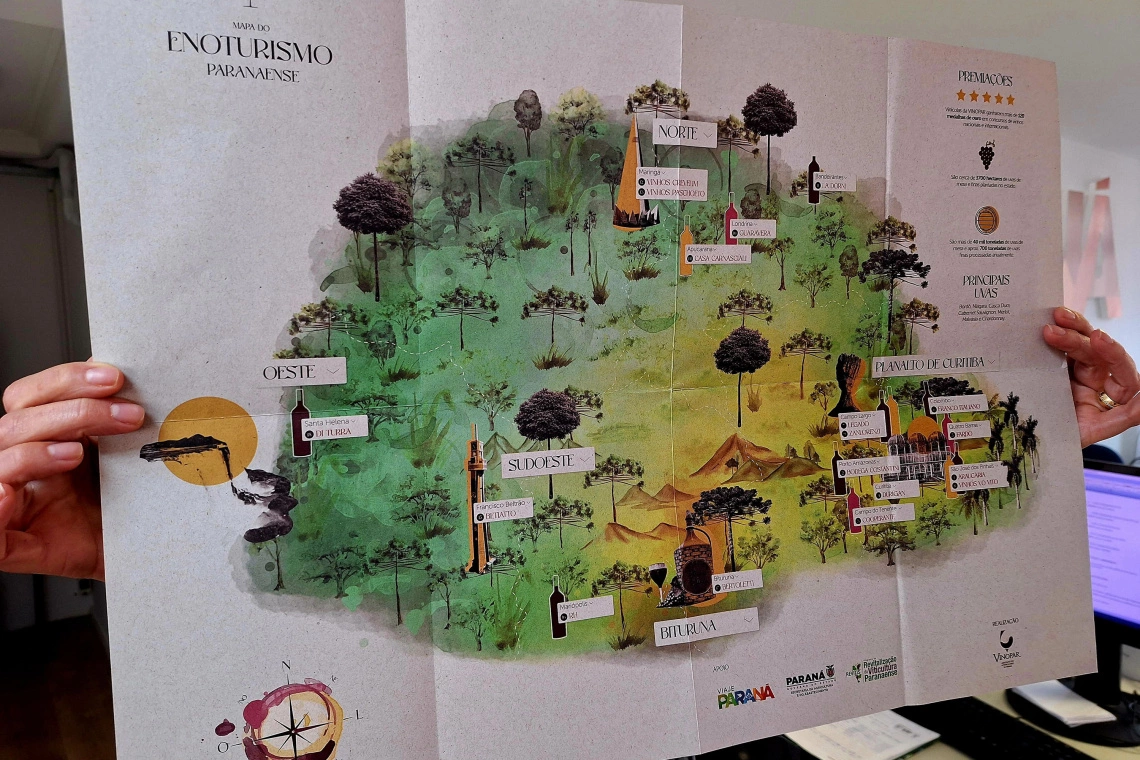 Elaborado pela Associação de Vitivinicultores do Paraná (Vinopar), em parceria com o Viaje Paraná, órgão de promoção do turismo do Estado, e a Secretaria da Agricultura e Abastecimento (SEAB), o novo mapa valoriza vinhos estaduais e visitas de turistas a propriedades que cultivam uva e produzem itens derivados da fruta.