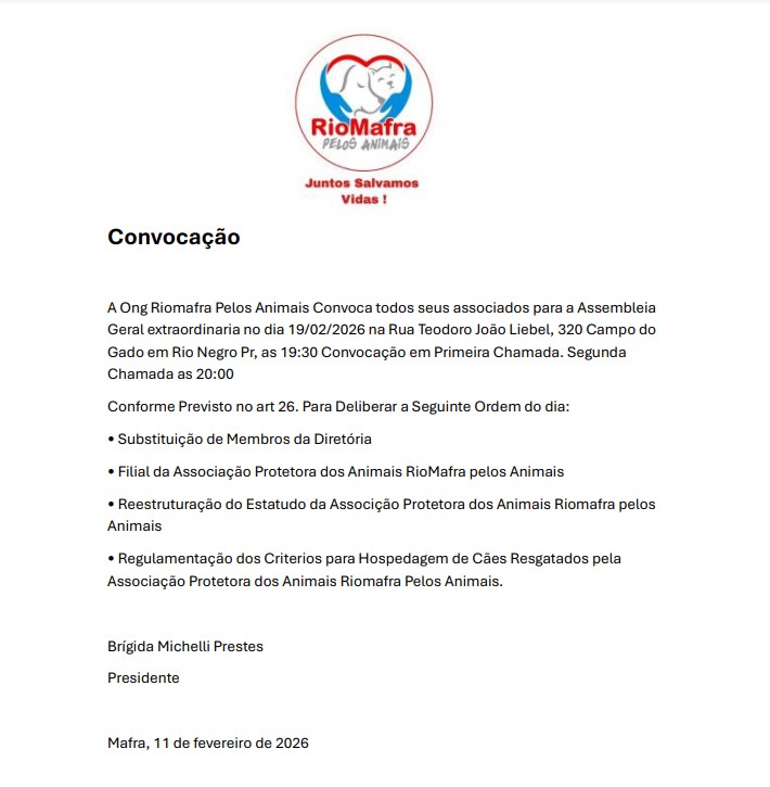 Ong Riomafra Pelos Animais – Edital de Convocação – 11/02/2026