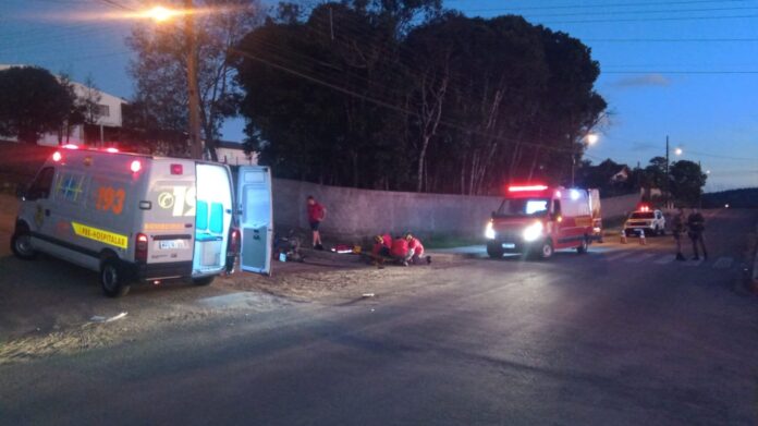 Para o local, foram encaminhadas duas guarnições de atendimento pré-hospitalar, que ao chegar constataram que se tratava de uma colisão frontal, entre os veículos Volkswagen/Saveiro, cor branca e uma motocicleta Honda, cor azul, ambos com placas de Itaiópolis/SC.