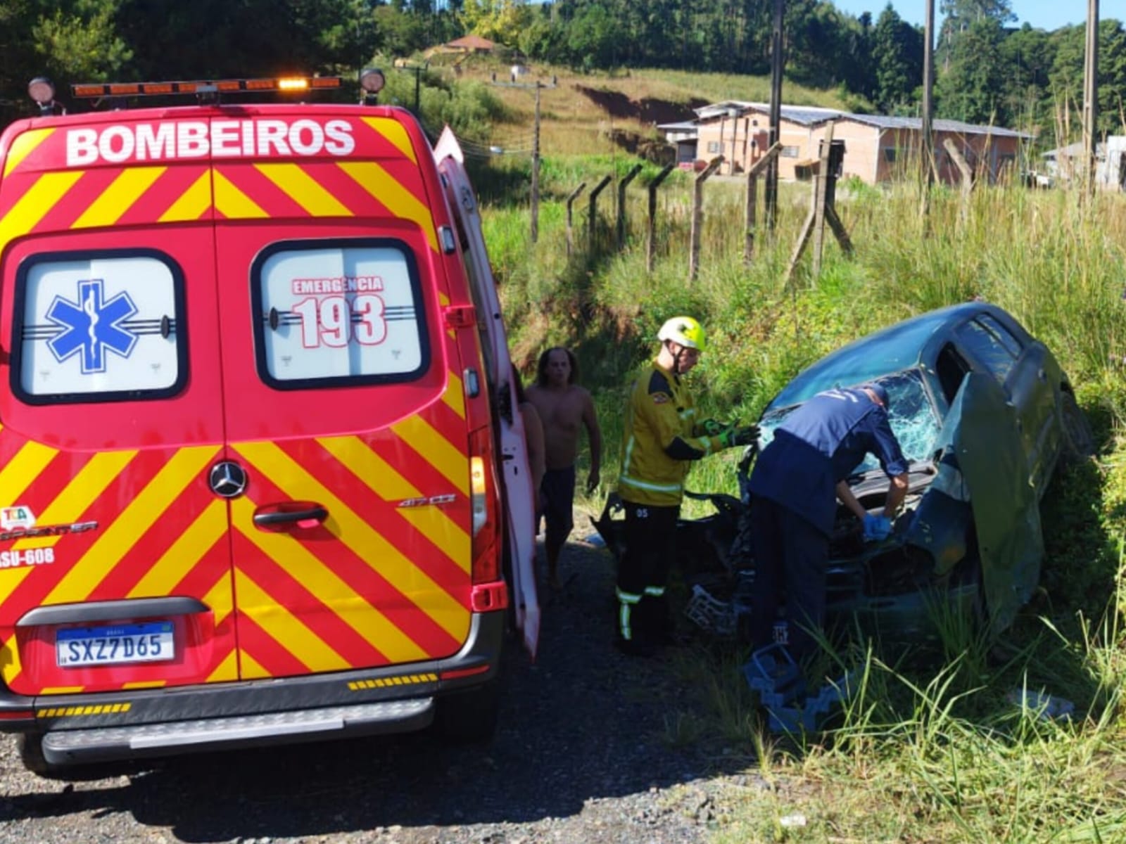 No local, os socorristas encontraram um homem de 29 anos, deitado no gramado às margens da rodovia. Ele era amparado por uma mulher que ajudava a conter um sangramento na região da testa.