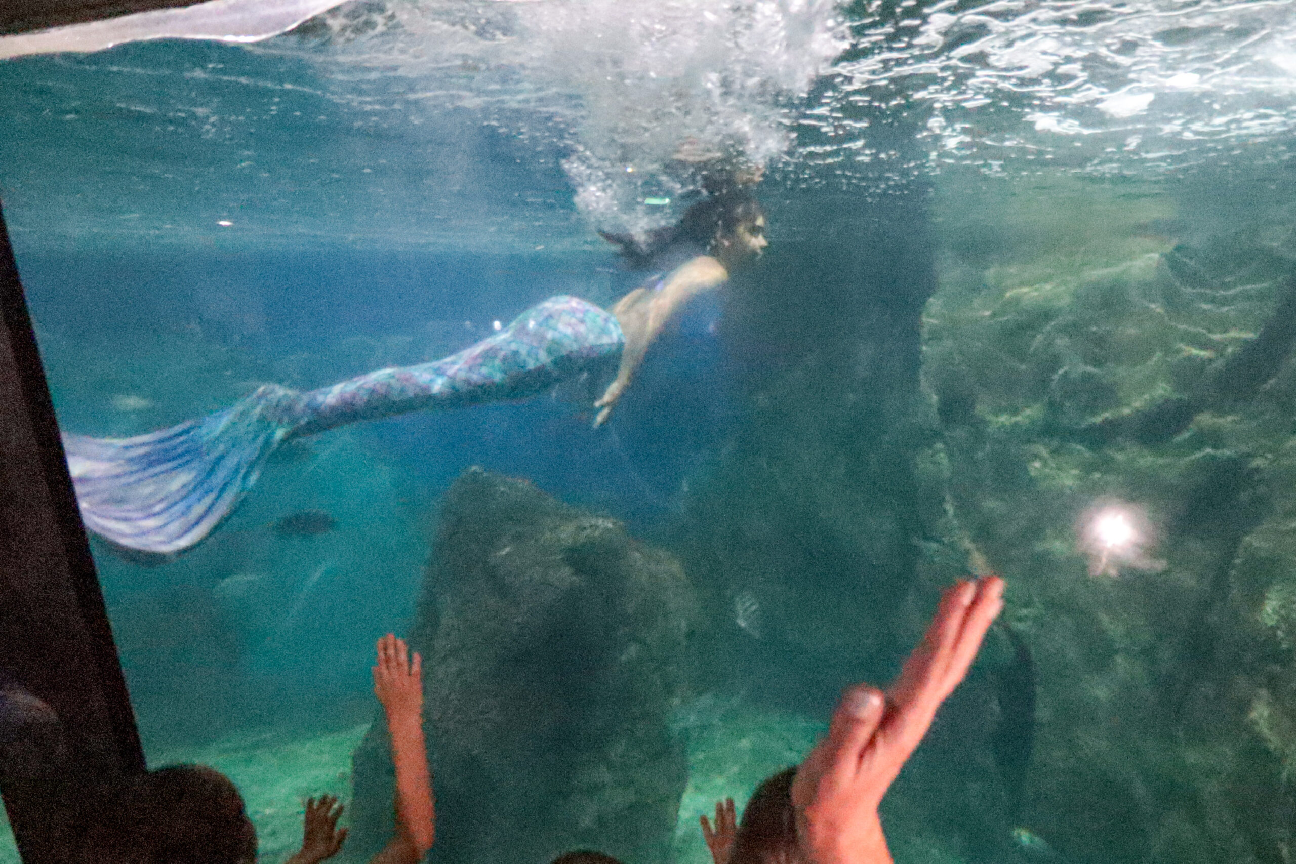 “A gente precisa treinar bastante a apneia e a resistência muscular e respiratória. Posso ficar até um minuto submersa, mas como tem muito movimento e interação, a média de apneia é de uns 40 segundos, até voltar para a superfície para respirar”, explica a sereia. “Eu coloco uma calda e tem um peso entre as pernas, então precisa ter muita resistência muscular, principalmente nas pernas”.