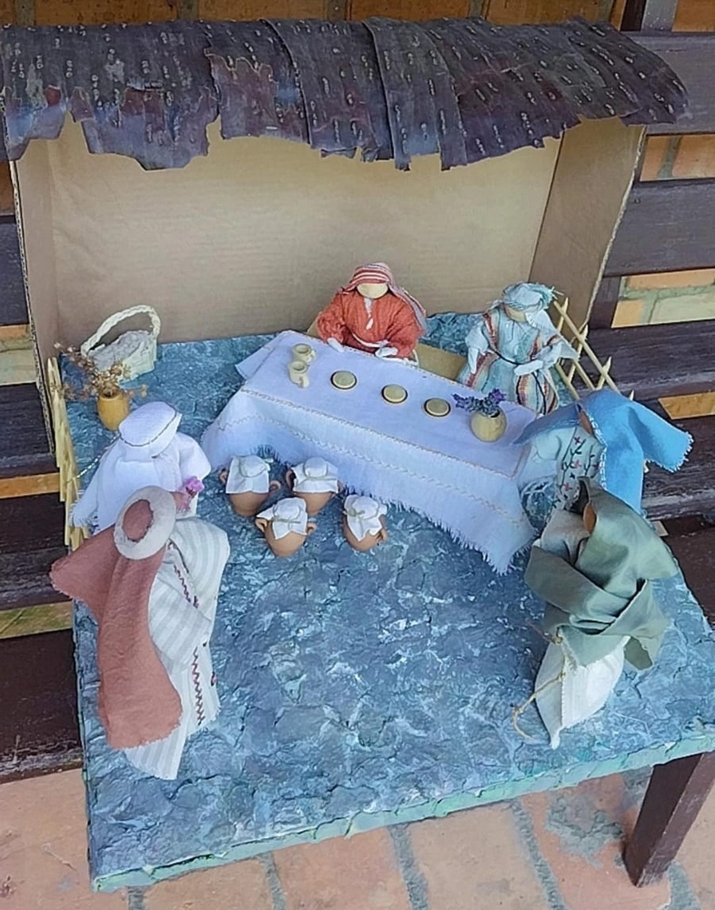 A cena bíblica “Bodas de Canãa” está apresentada em uma base de madeira, revestida com papel reciclado, madeira de reaproveitamento e de reflorestamento. As vestimentas são de tecidos de algodão e linho com bordado a mão. O telhado do cenário foi feito com revestimento do tronco do pinheiro Araucária.