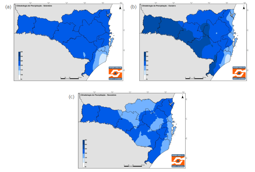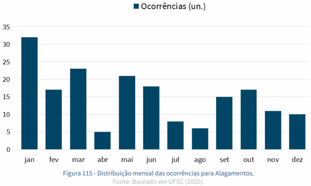 De acordo com o Perfil Histórico de Desastres do Plano Estadual de Proteção e Defesa Civil de Santa Catarina (PPDC-SC), que abrange 29 anos de dados (1995-2019) e 5.540 ocorrências de desastres, os períodos de chuvas mais intensas costumam se concentrar entre os meses de setembro e março.