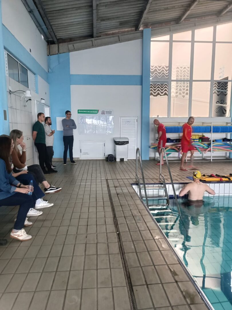 Além disso, os servidores receberam instrução prática sobre técnicas de resgate em piscina, ministrada pelo cabo Robinson e pelo bombeiro voluntário Yuri. O treinamento abordou as ações corretas a serem tomadas em casos de mal-estar ou perda de consciência de alunos durante atividades aquáticas, destacando a calma, a cooperação em equipe e a rapidez na resposta como elementos essenciais para um atendimento eficaz.