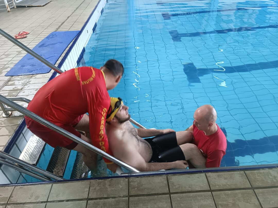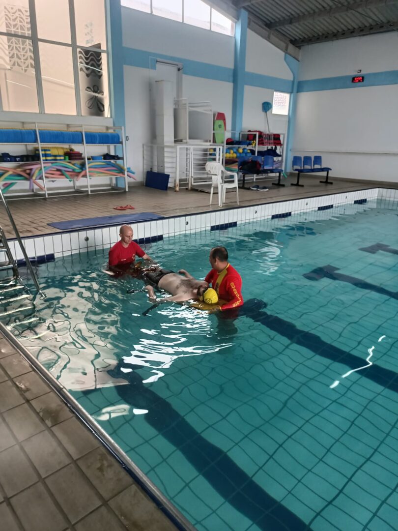 Além disso, os servidores receberam instrução prática sobre técnicas de resgate em piscina, ministrada pelo cabo Robinson e pelo bombeiro voluntário Yuri. O treinamento abordou as ações corretas a serem tomadas em casos de mal-estar ou perda de consciência de alunos durante atividades aquáticas, destacando a calma, a cooperação em equipe e a rapidez na resposta como elementos essenciais para um atendimento eficaz.