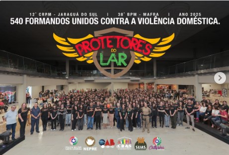 Na quarta-feira, 12, o Espaço Álamos, em Mafra, foi palco de mais uma formatura do projeto Protetores do Lar, desenvolvido pela Polícia Militar de Santa Catarina (PMSC). O evento marcou o compromisso de 540 adolescentes na luta contra a violência doméstica, em uma cerimônia emocionante que contou com a presença de autoridades, familiares e convidados.