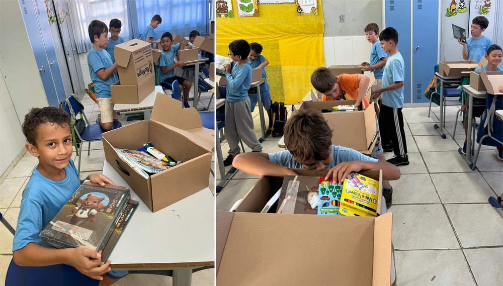 Os materiais são de altíssima qualidade e foram separados de acordo com a faixa-etária dos alunos. Há cadernos, agenda escolar, estojo de canetinhas, lápis de cor, lápis grafite, apontador, borracha, massa de modelar, tinta guache, pincel, giz de cera, tubo de cola, tesoura escolar, régua, estojo escolar e pasta para montagem do kit.