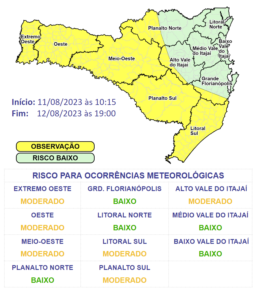A agitação marítima e os temporais apresentam risco baixo e moderado para ocorrências. Riscos como destelhamentos, queda de galhos e árvores, danos na rede elétrica e alagamentos pontuais é moderado nas áreas em amarelo do mapa e baixo nas áreas em verde do mapa.