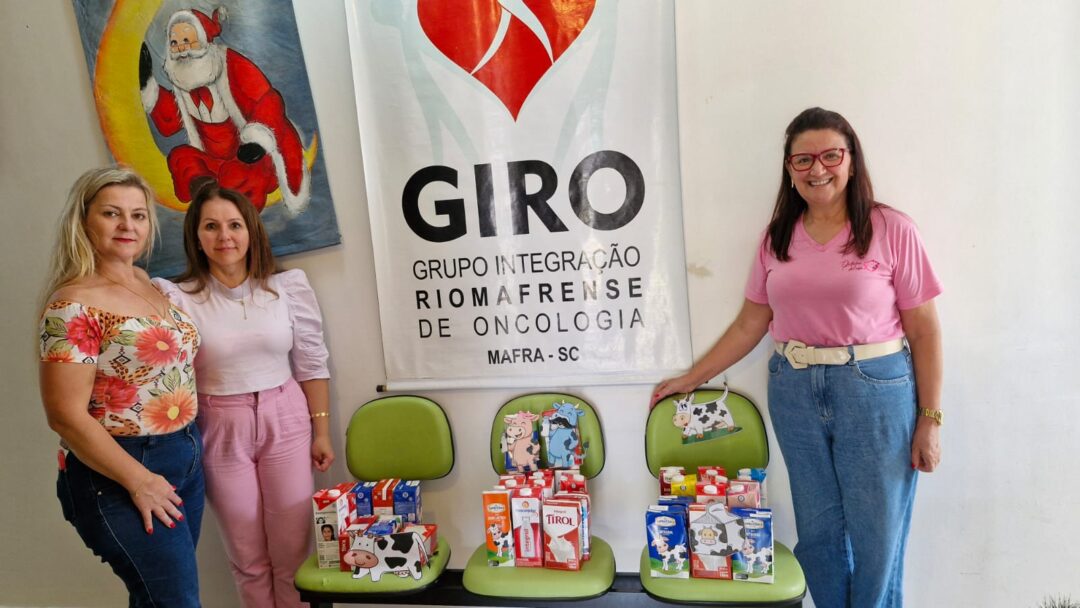 Na tarde desta terça-feira, 2 de dezembro, as servidoras da Prefeitura de Mafra, Dircélia Pilz Mazur e Bianca Huren, em nome dos demais colegas da Administração Municipal, levaram até a GIRO (Grupo Integração Riomafrense de Oncologia) os litros de leite arrecadados na campanha interna “Outubro Rosa e Novembro Azul”. A coordenadora da GIRO, Rosemeri Souza Farias recebeu as doações e agradeceu novamente a colaboração dos servidores.
