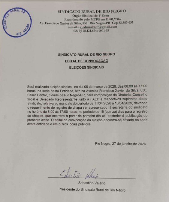 InícioPublicidade LegalSindicato Rural de Rio Negro - Edital de Convocação - 02/02/2026 Publicidade Legal Sindicato Rural de Rio Negro – Edital de Convocação – 02/02/2026 Compartilhado FacebookTwitterWhatsAppCopy URL 2 de fevereiro de 2026 Compartilhado FacebookTwitterWhatsAppCopy URL Artigo anteriorBrasil bate Argentina e conquista 12º título na Copa América de FutsalPróximo artigoAulas na rede municipal de Rio Negro iniciarão no dia 5 de fevereiro
