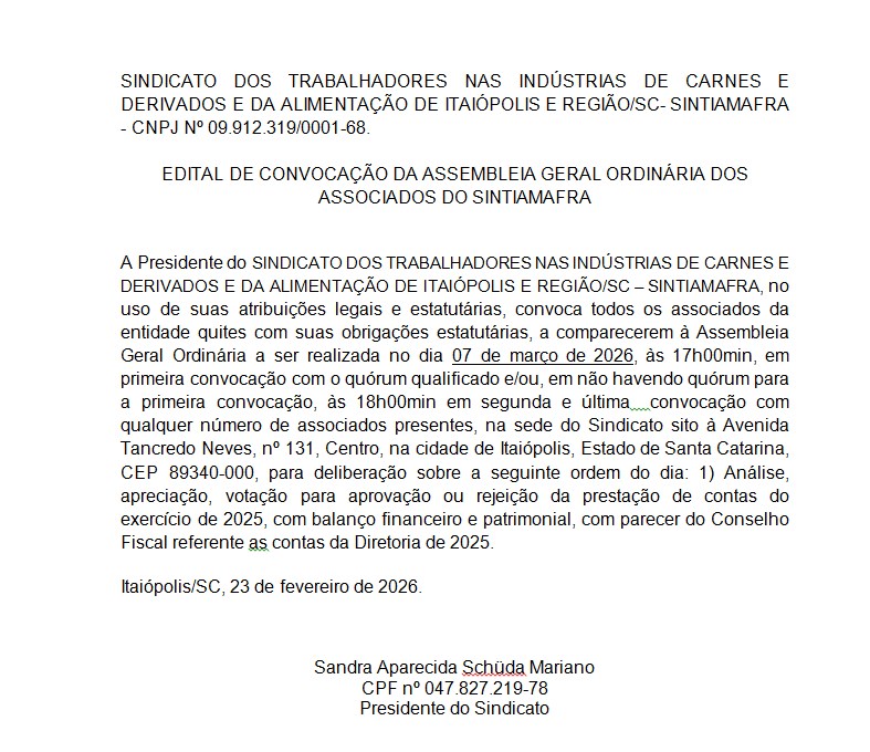 InícioPublicidade LegalSintiamafra - Edital de Convocação - 24/02/2026 Publicidade Legal Sintiamafra – Edital de Convocação – 24/02/2026 Compartilhado FacebookTwitterWhatsAppCopy URL 24 de fevereiro de 2026 Compartilhado FacebookTwitterWhatsAppCopy URL Artigo anteriorApós recuperar R$ 380 milhões, programa Regulariza Paraná entra na reta finalPróximo artigoMulher pega carro por engano e mobiliza Polícia Militar em Mafra