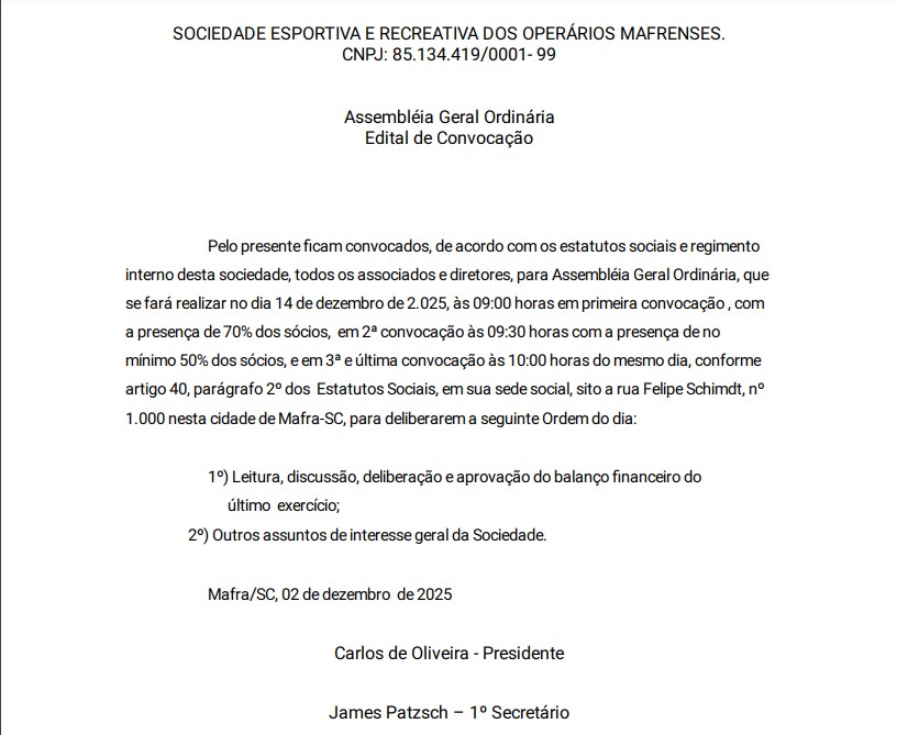 Sociedade Esportiva e Recreativa dos Operários Mafrenses Edital de Convocação – 06/12/2025