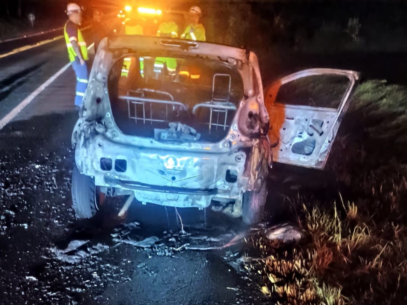 O automóvel encontrava-se no acostamento da rodovia totalmente tomado pelas chamas, já em fase de diminuição.