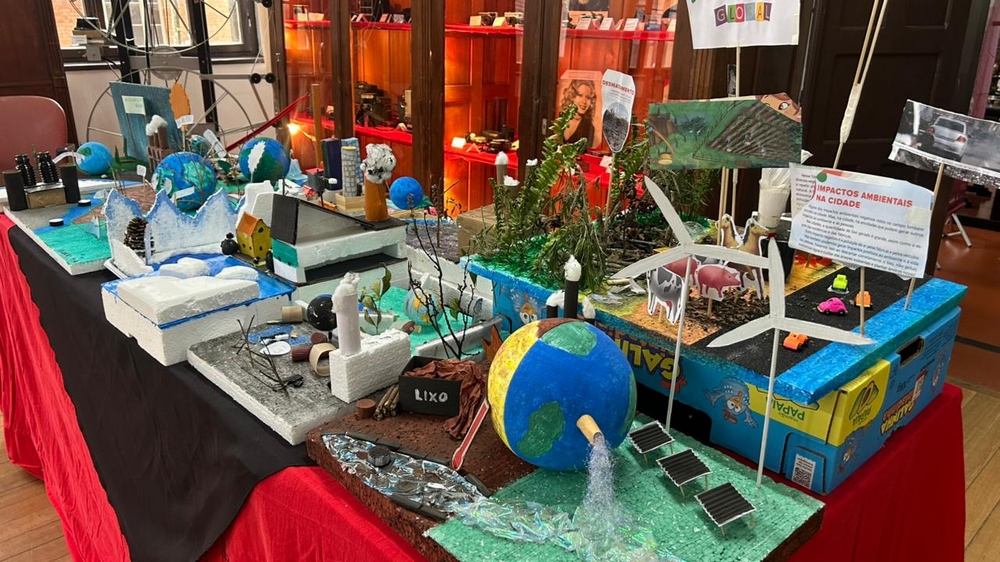 As atividades foram variadas e envolventes durante o evento de abertura da exposição. A turma do 4º ano da Escola Municipal Vereador Ricardo Nentwig participou da criação de maquetes, mostrando de forma criativa como as mudanças climáticas impactam o planeta e como podemos agir para minimizar esses efeitos.
